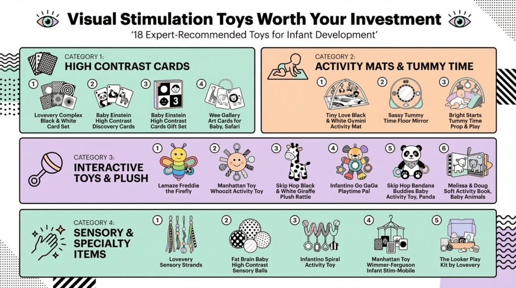 After reviewing dozens of visual stimulation toys, the Lovevery Complex Black and White Card Set stands out as the single best starting point for any budget. These cards deliver research-backed visual development support at an accessible price, need zero assembly or storage space, and travel anywhere efficiently.
