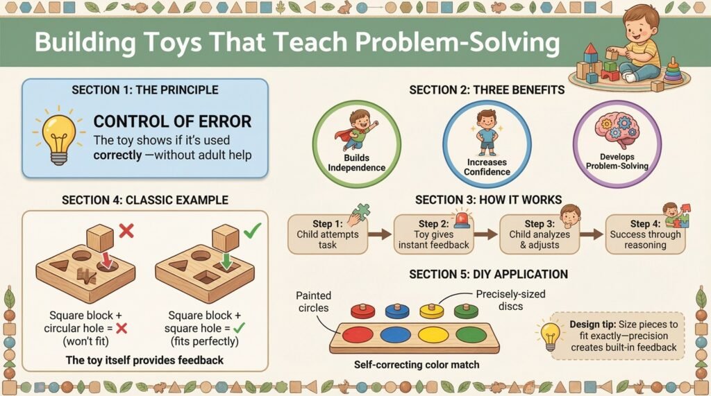 Build control of error into designs so the toy itself provides feedback, developing independence and problem-solving skills without adult intervention.