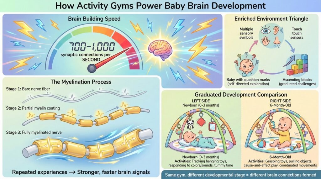 When you lay a three-month-old under those dangling toys, you’re not teaching them to reach. You’re creating conditions where their brain, which is already frantically building neural pathways at a rate it will never match again in life, can practice patterns of movement that strengthen specific connections.
