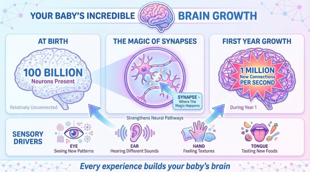 Your baby’s brain forms about one million new neural connections per second during the first year, and sensory experiences drive this remarkable growth through repeated activation of neural pathways.