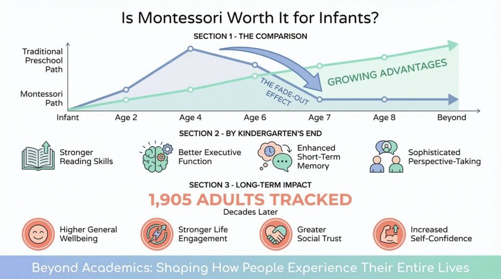 Montessori for infants delivers measurable long-term benefits when you have access to authentic, well-implemented programs that align with your values and budget. The research supporting cognitive, social, and emotional advantages is stronger than for most early education approaches, with the crucial distinction that advantages compound as opposed to fade over time.