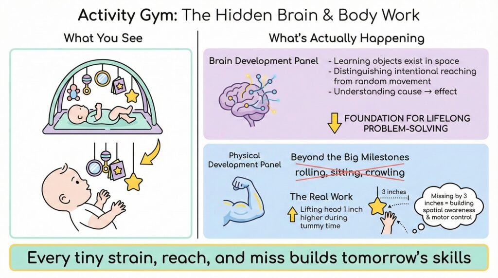 I’m talking about recognizing where your baby is right now, what they’re physically capable of doing, and how to arrange their environment to support the exact skills they’re working on this week. Development happens in waves rather than straight lines, and your approach to the activity gym needs to reflect that reality.
