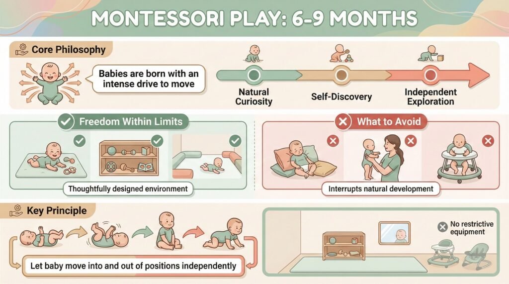The Montessori approach emphasizes giving babies freedom to move on their own timeline without adult interference. This means lots of floor time, avoiding containers and positioning devices, and creating a safe environment where babies can explore movement independently as opposed to being propped or placed in positions they can’t achieve themselves.