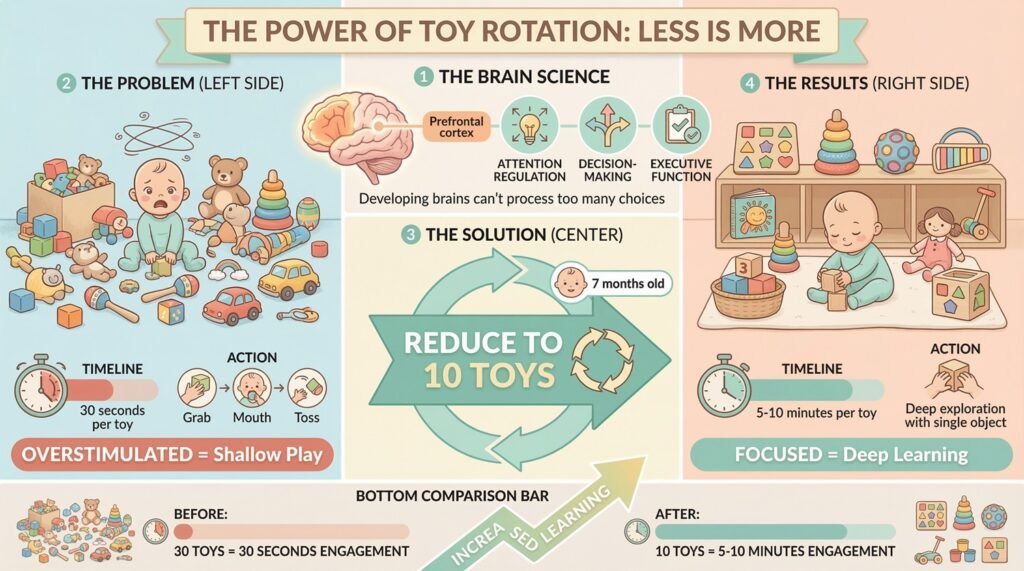 Toy rotation reduces overstimulation and significantly improves the quality of your baby’s engagement with person toys by limiting choices to a manageable number, typically 8-12 items for babies under one year.