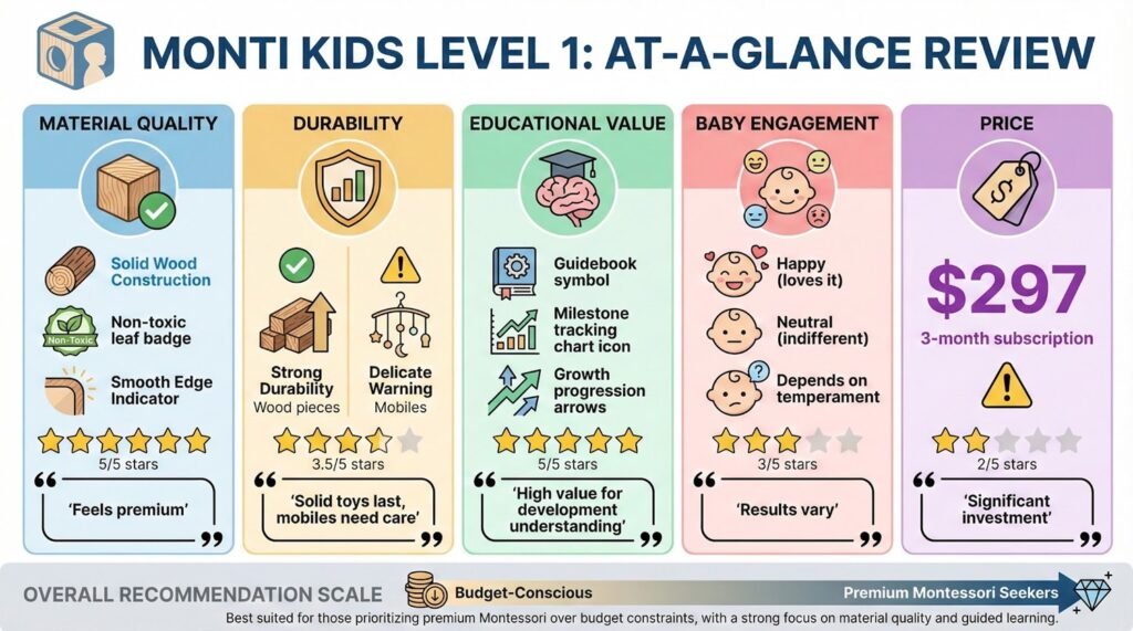 Monti Kids Level 1 delivers what it promises: high-quality, developmentally suitable materials grounded in Montessori philosophy, plus substantial parent education.