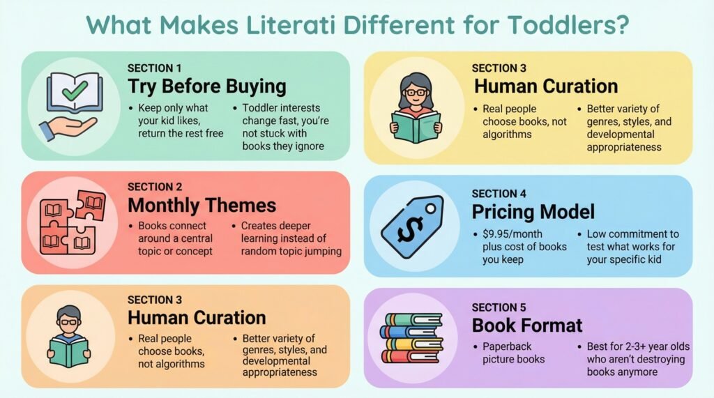 You’re paying roughly $2 per book to test whether it works for your specific kid. Combined with free returns and monthly themes that create structure, it addresses real frustrations with toddler book selection.