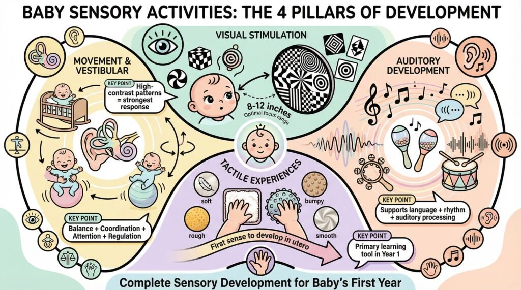 Baby sensory activities target many sensory systems, visual, auditory, tactile, vestibular, proprioceptive, and sometimes olfactory, to support rapid brain development during the first year of life. The activities are based on neuroscience research showing that specific types of sensory input during critical periods support optimal neural pathway formation.