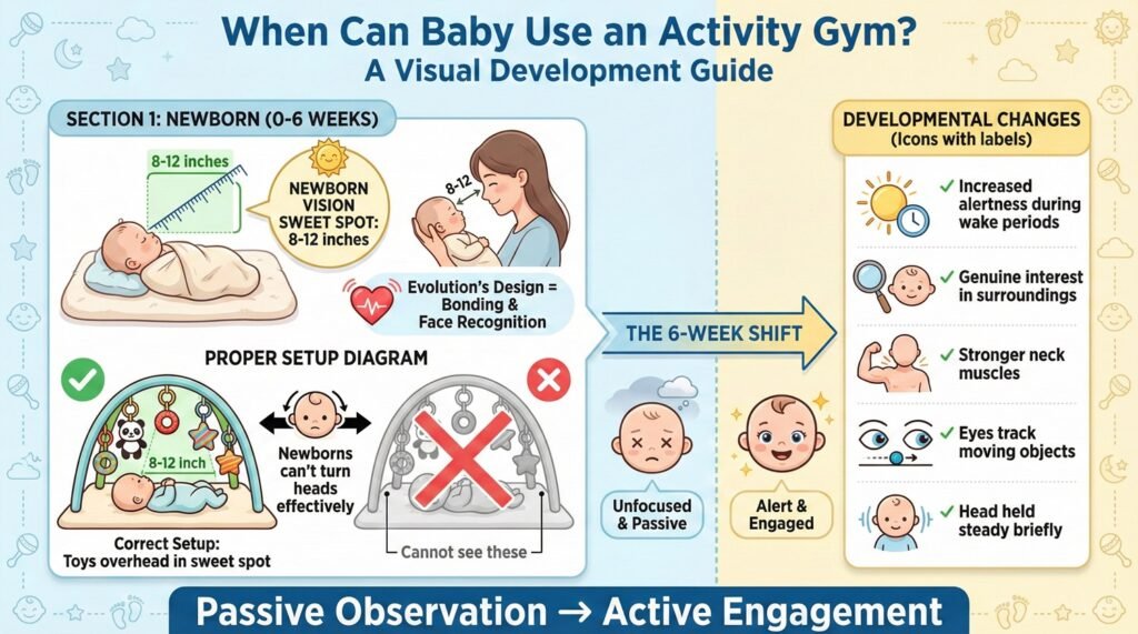 Babies can technically start using activity gyms from birth, though most parents wait somewhere between 2 weeks and 3 months. That range exists for good reasons, and understanding where your baby falls within it determines whether the gym becomes a valuable developmental tool or just another piece of baby equipment you thought you needed.